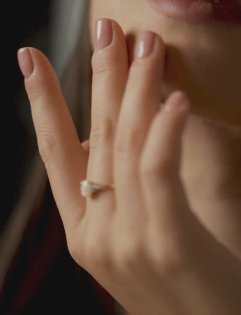 Featuring a 1/2 carat oval-cut Australian Opal, partnered with six natural white diamonds, all set in a band of 9K solid gold. The opal's play of colours, combined with the diamond's ethereal sparkle, creates an enchanting visual harmony.