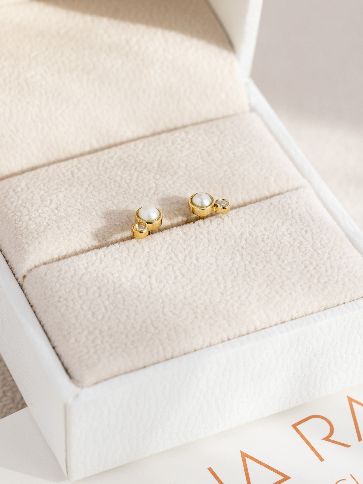 The Dara Studs are crafted from solid 9k gold with a weight of 0.7 grams per stud. Each stud features a freshwater pearl of 3.5mm diameter and a diamond of size 0.03ct. The total stud size is 4mm x 6.5mm. They are available in single or pair options.
