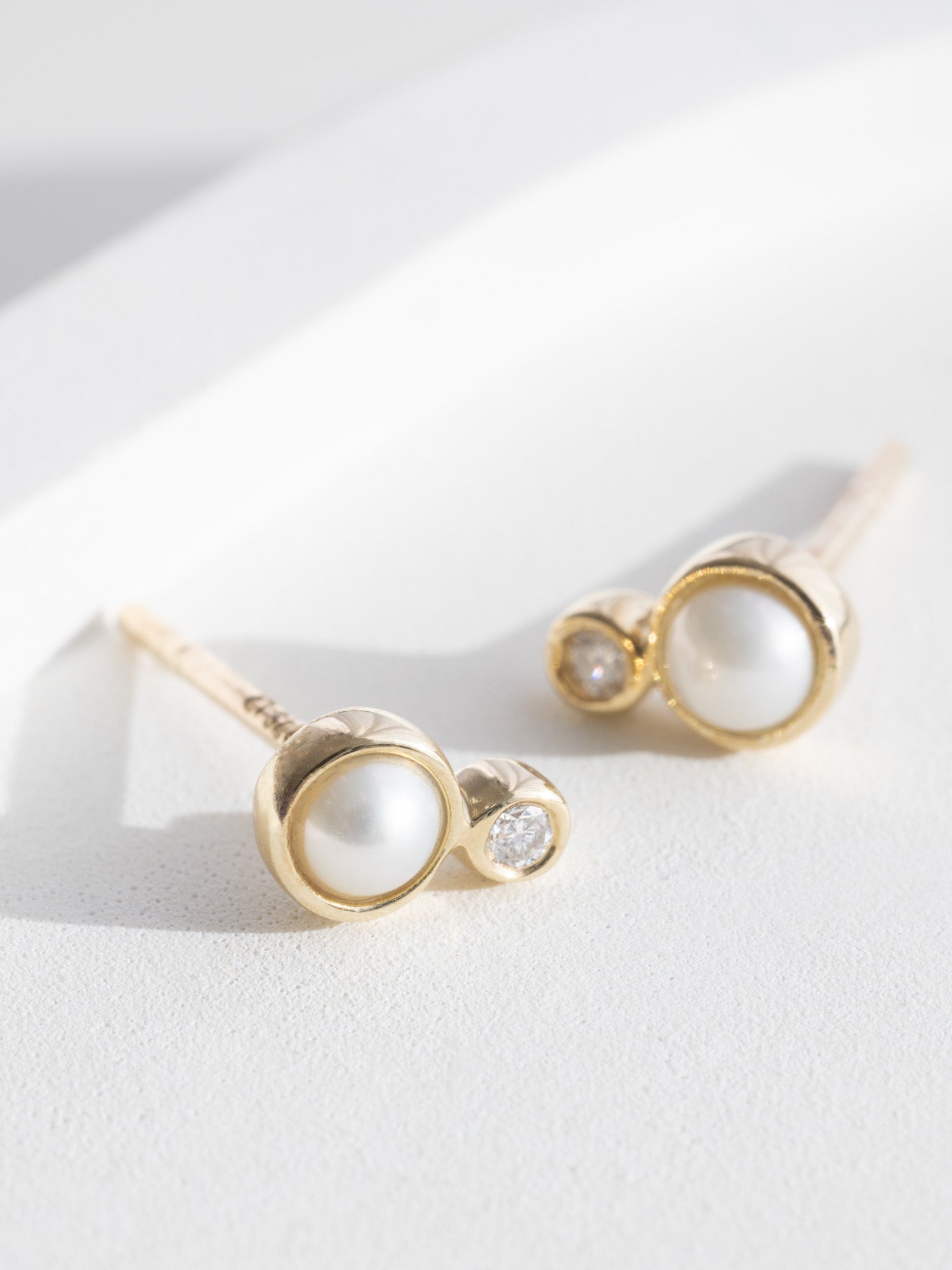 The studs showcase a beautiful freshwater pearl and a natural, conflict-free diamond, symbols of purity, love, and rare treasures that are meant to last a lifetime.