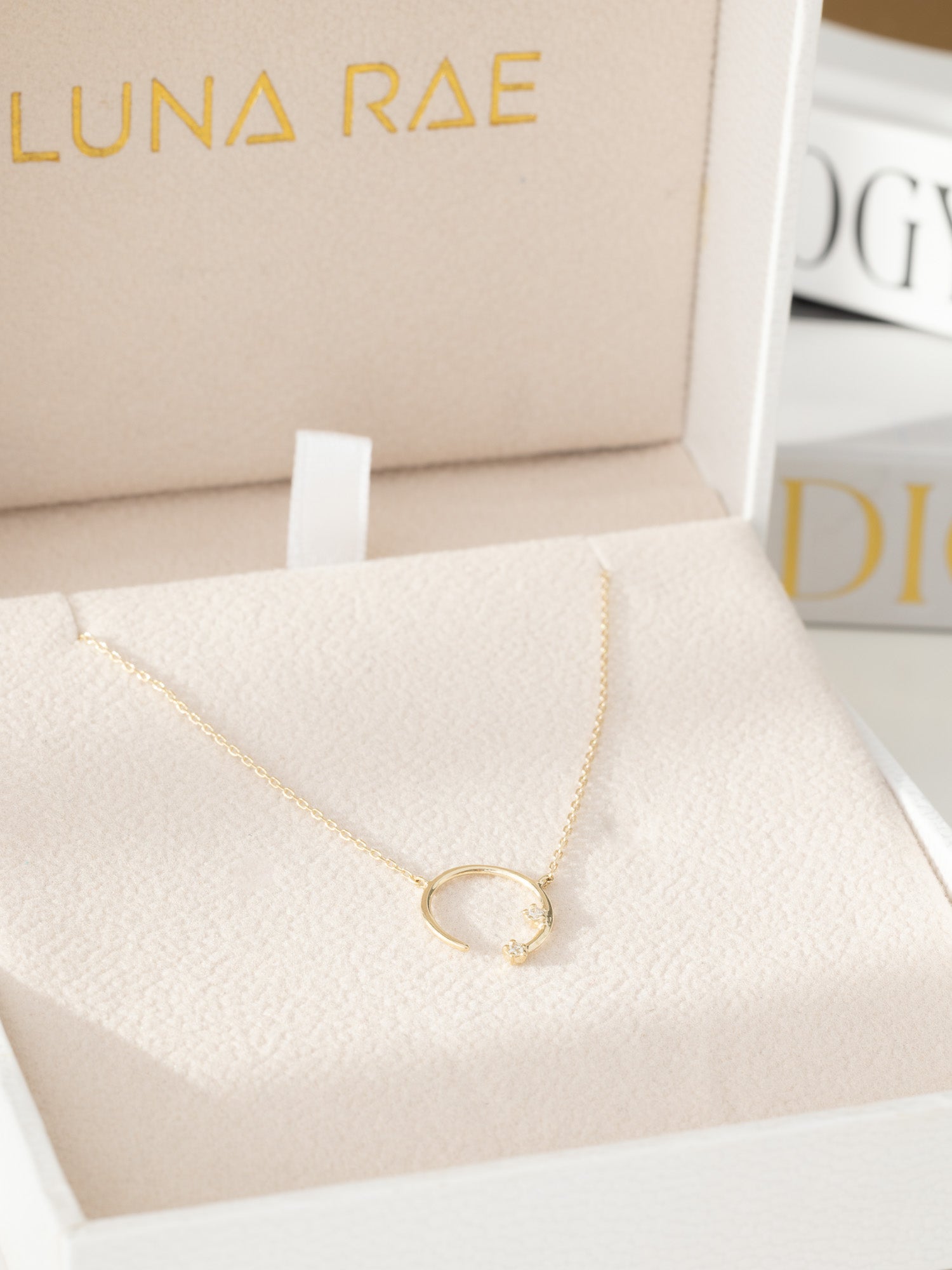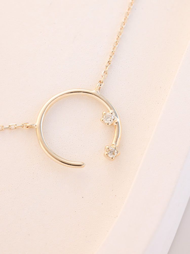 Embrace transformation with the Eclipse Necklace. Drawing inspiration from the moons Eclipse. An open base halo — to let the bad energy go and the good stay. ✨made from solid 9K gold, shines with two brilliant white diamonds, radiating the timeless beauty and strength of the Moon Goddess.