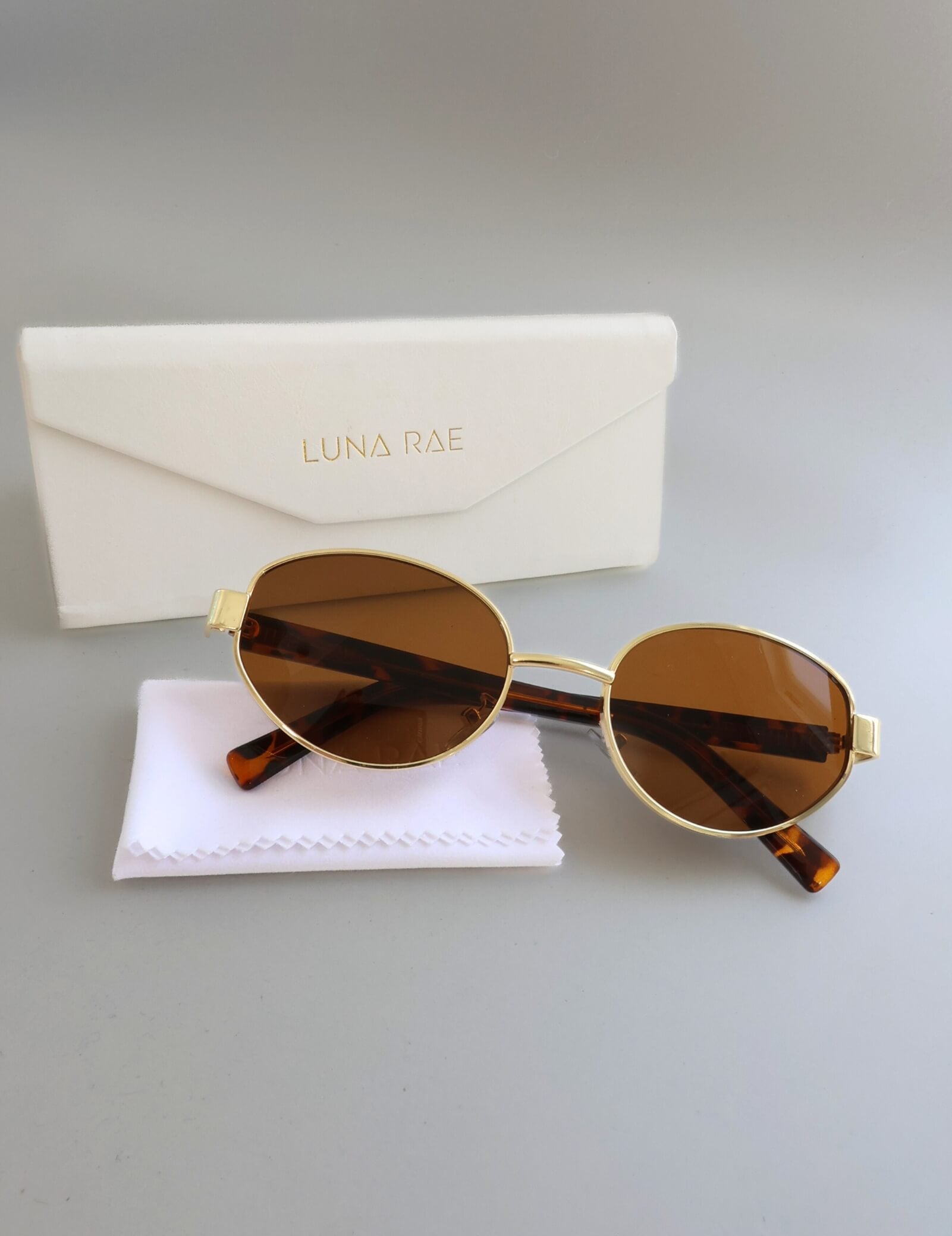 A classic pair you’ll keep reaching for. Golden Hour Sunglasses feature slim gold rims, softly rounded lenses, and tortoiseshell temples for a warm, easy-to-wear look.