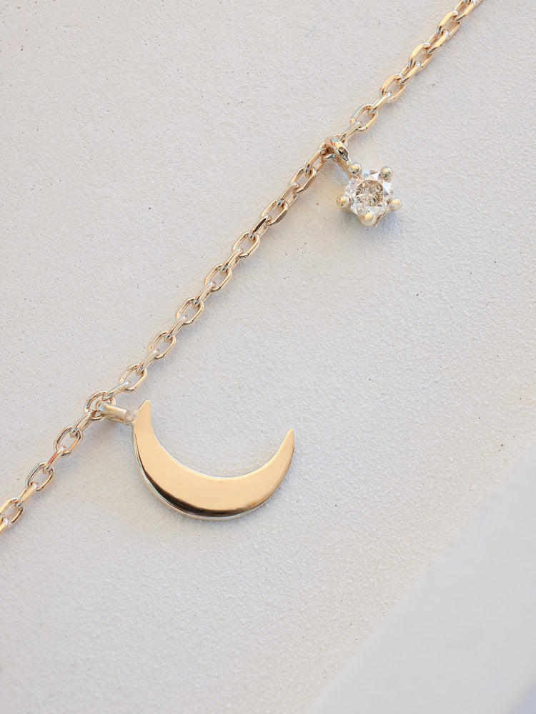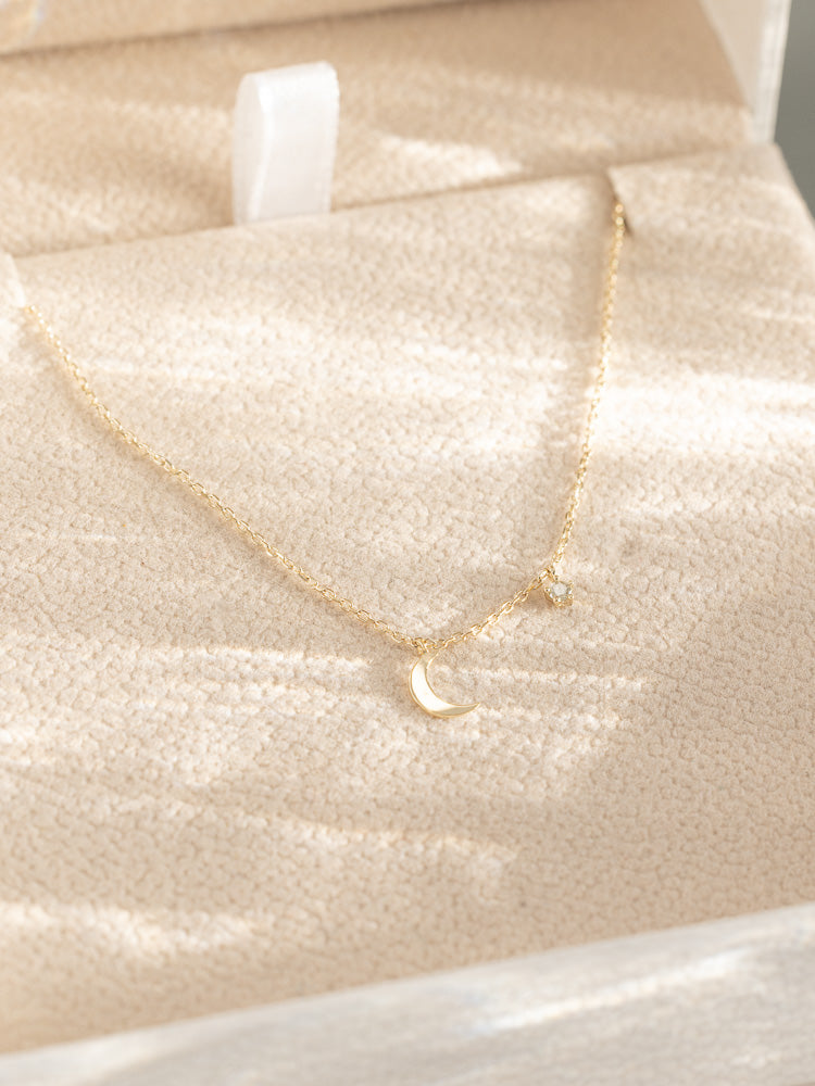 Crafted from solid 9K gold, it features a delicate moon pendant, embodying the strength and femininity of the Moon Goddess. Paired with a brilliant cut white diamond that adds a touch of daily luxury, this necklace captures the ethereal charm of the moonlight.