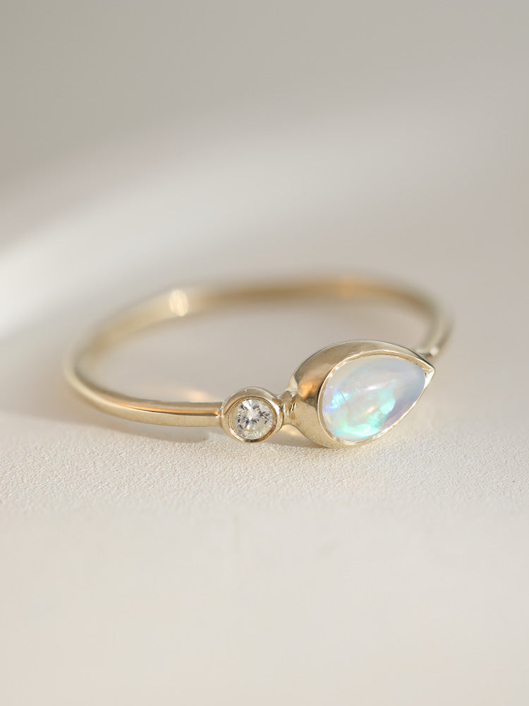 The Higher Love Ring has a gold weight between 1.1 and 1.3 grams. The Australian Opal is 6.5mm x 4.4mm in size. The ring is available in three sizes: Small (size 6 with a 16.3mm inside diameter), Medium (size 7 with a 17.1mm inside diameter), and Large (size 8 with a 17.9mm inside diameter).