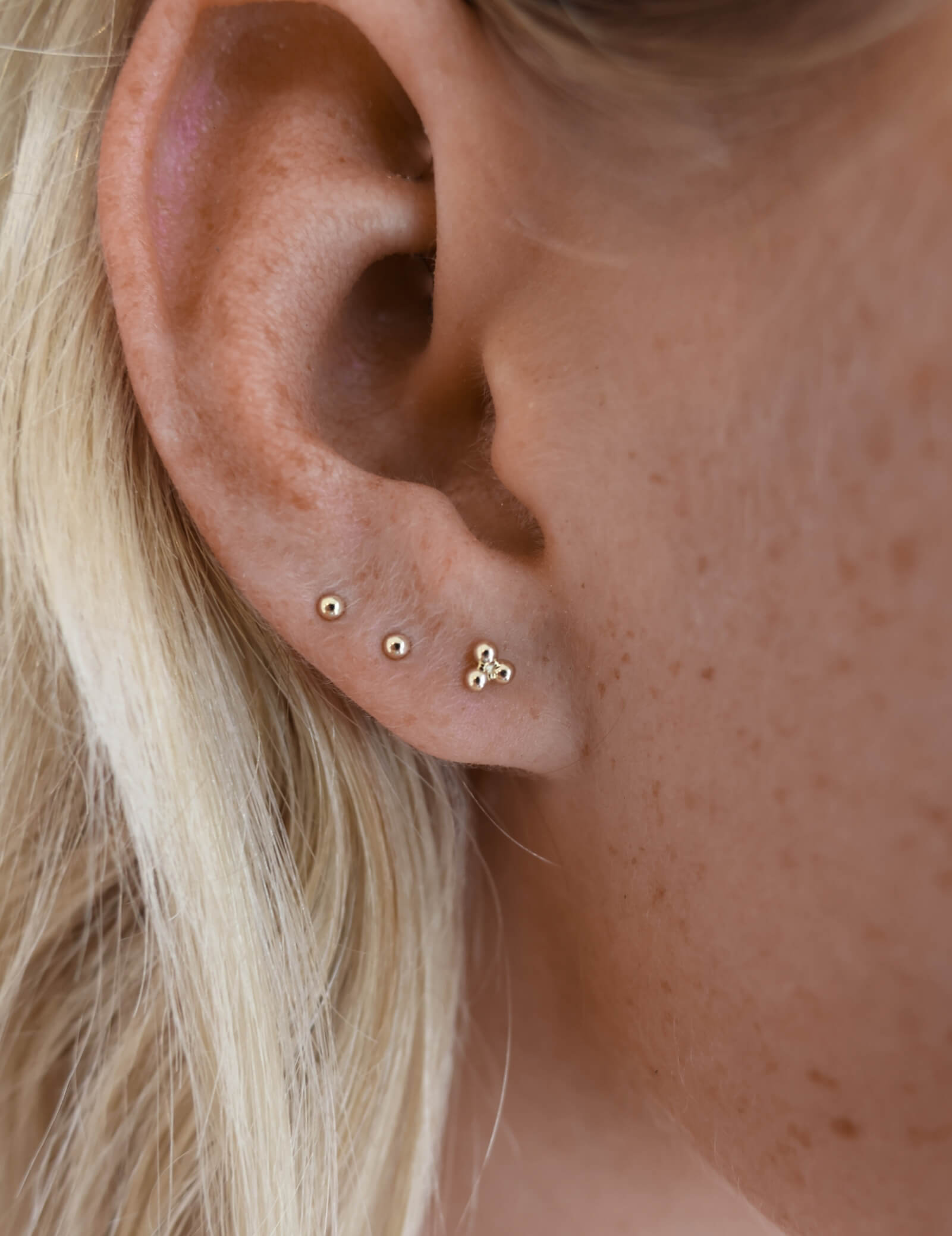Petite Trio Studs feature a trio of 3 x 2mm gold balls 4mm each side, crafted in solid 9K gold with a total weight of 0.18g.