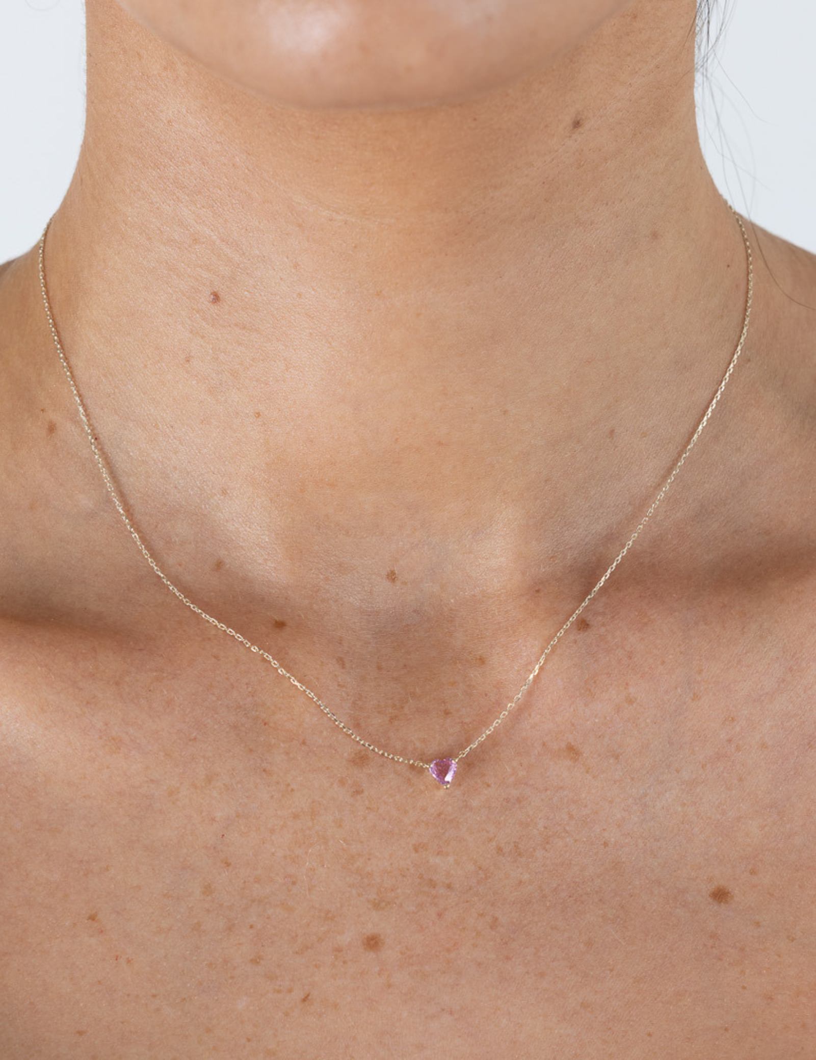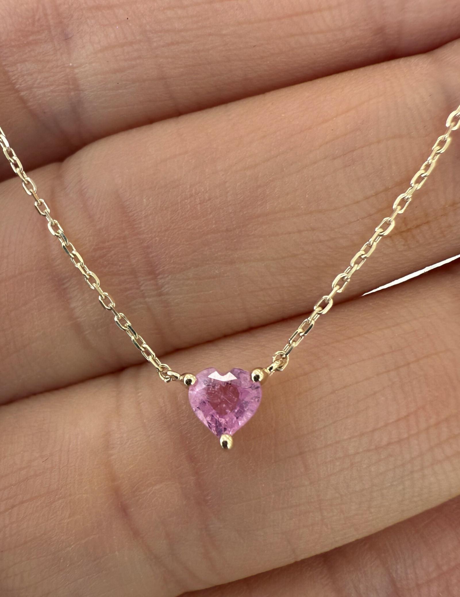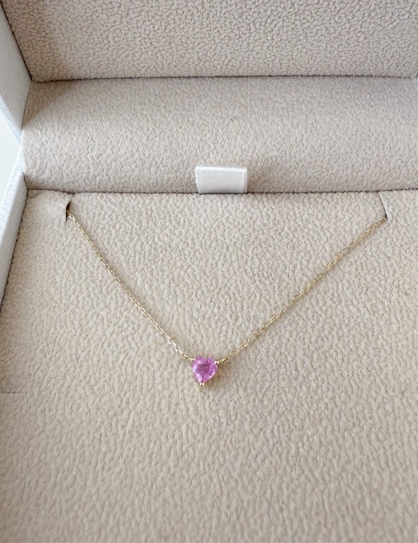 The Pink Sapphire Heart Necklace features a natural pink sapphire heart measuring 4mm x 4mm, set in solid 9K gold. With a total gold weight of approximately 1g. The necklace length is 40 cm with no extension.
