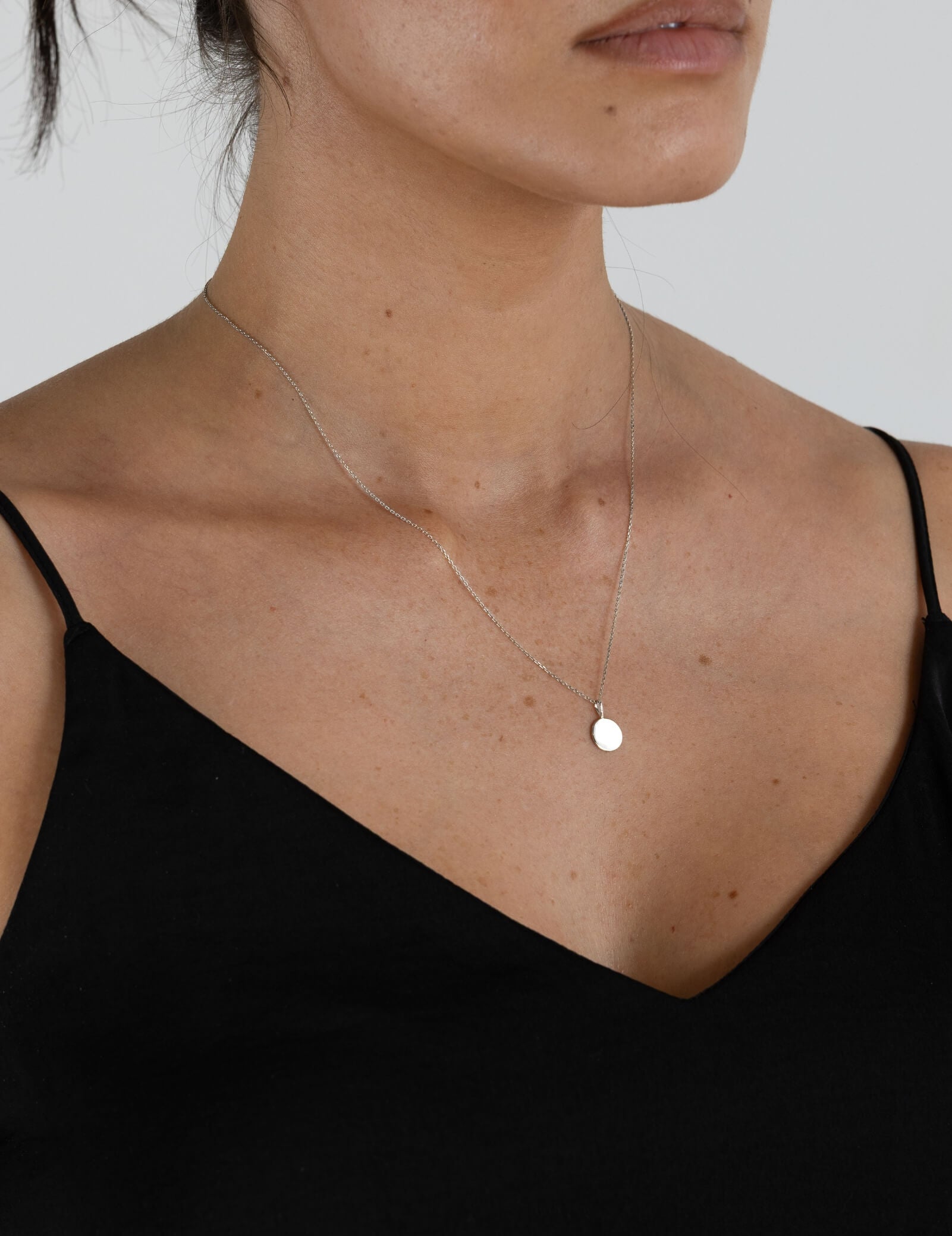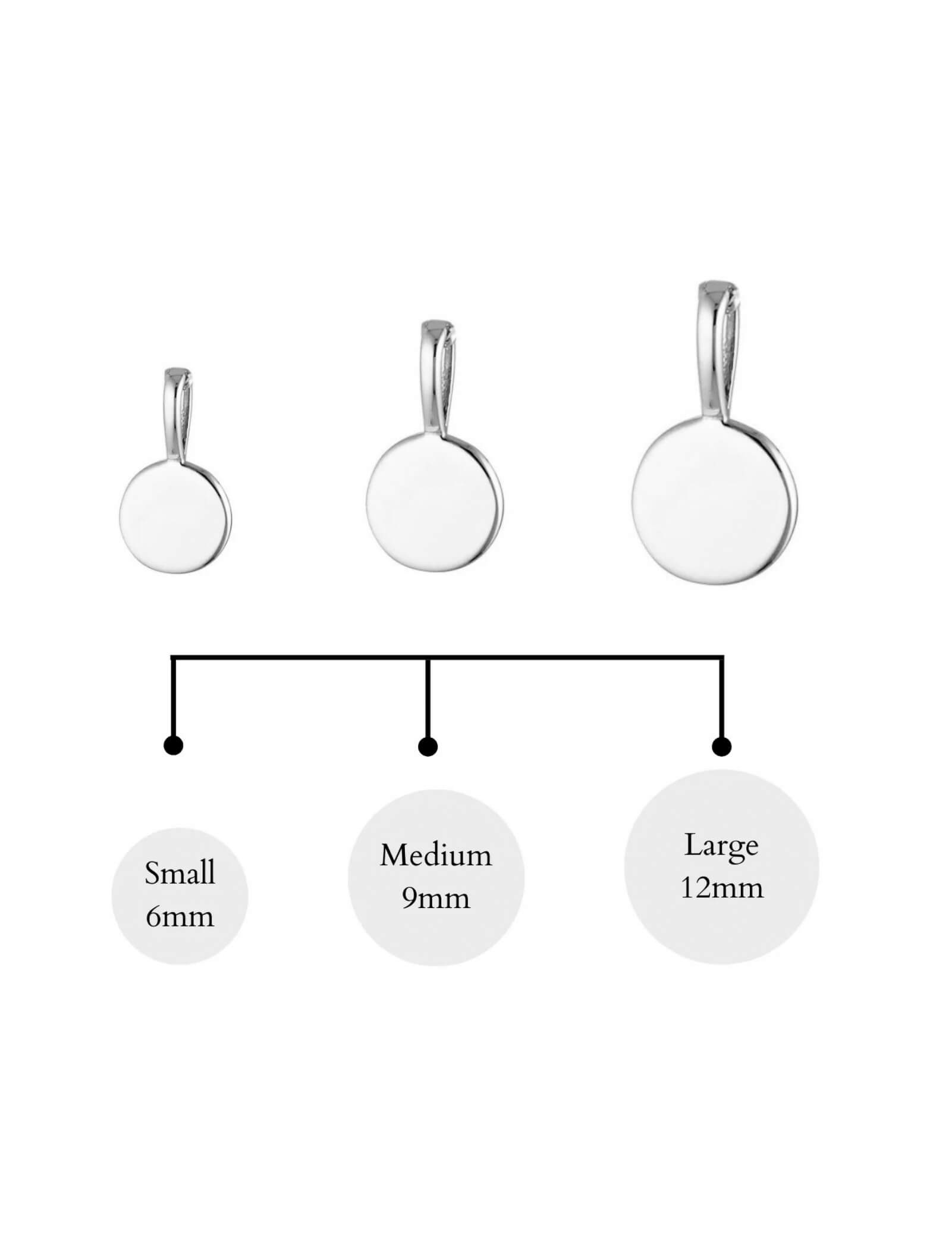 The Flat Disc Pendant comes in three sizes—Small (6 mm diameter, 0.8 mm thick, 4.7 mm bail height), Medium (9 mm diameter, 0.8 mm thick, 4.7 mm bail height), and Large (12 mm diameter, 0.8 mm thick, 4.7 mm bail height). Each size is lightweight and perfect for stacking, engraving, or wearing solo as a timeless, organic accent.