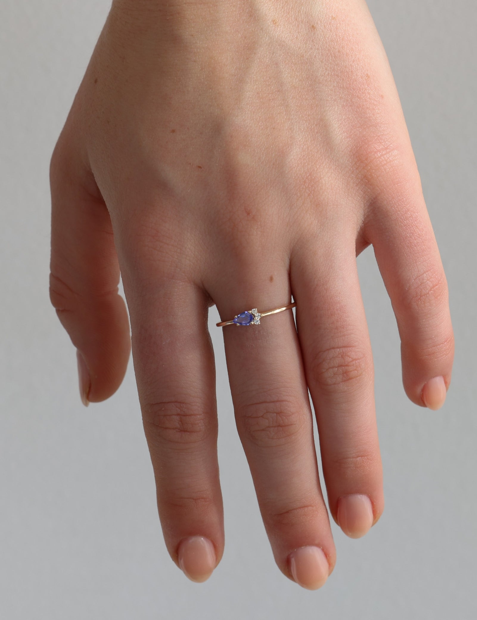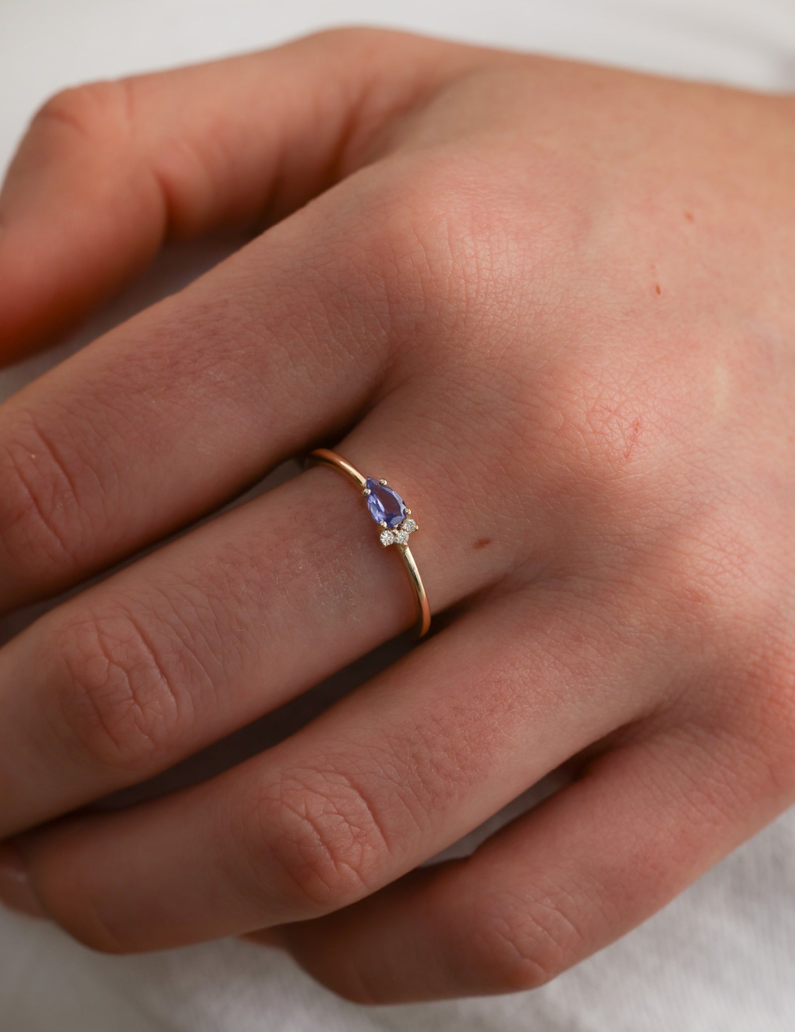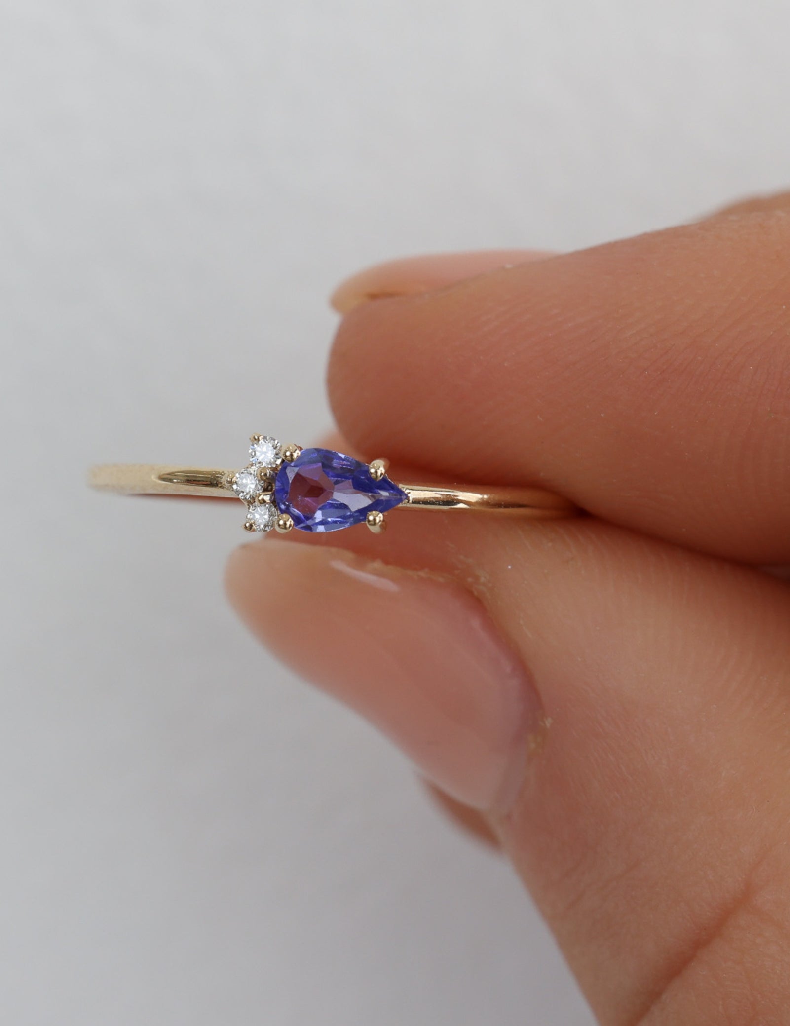 The Tanzanite Dream Ring features a band width of 1.20mm and a thickness of 1.10mm, adorned with three 1.20mm round white diamonds (F/C, I1-I2, I color).The stunning 5x3 mm AAA-grade pear-cut Tanzanite at the center has an average weight of 0.024ct. Crafted from solid 9k gold, the ring offers a perfect blend of elegance and brilliance, weighing approximately 0.98 grams.