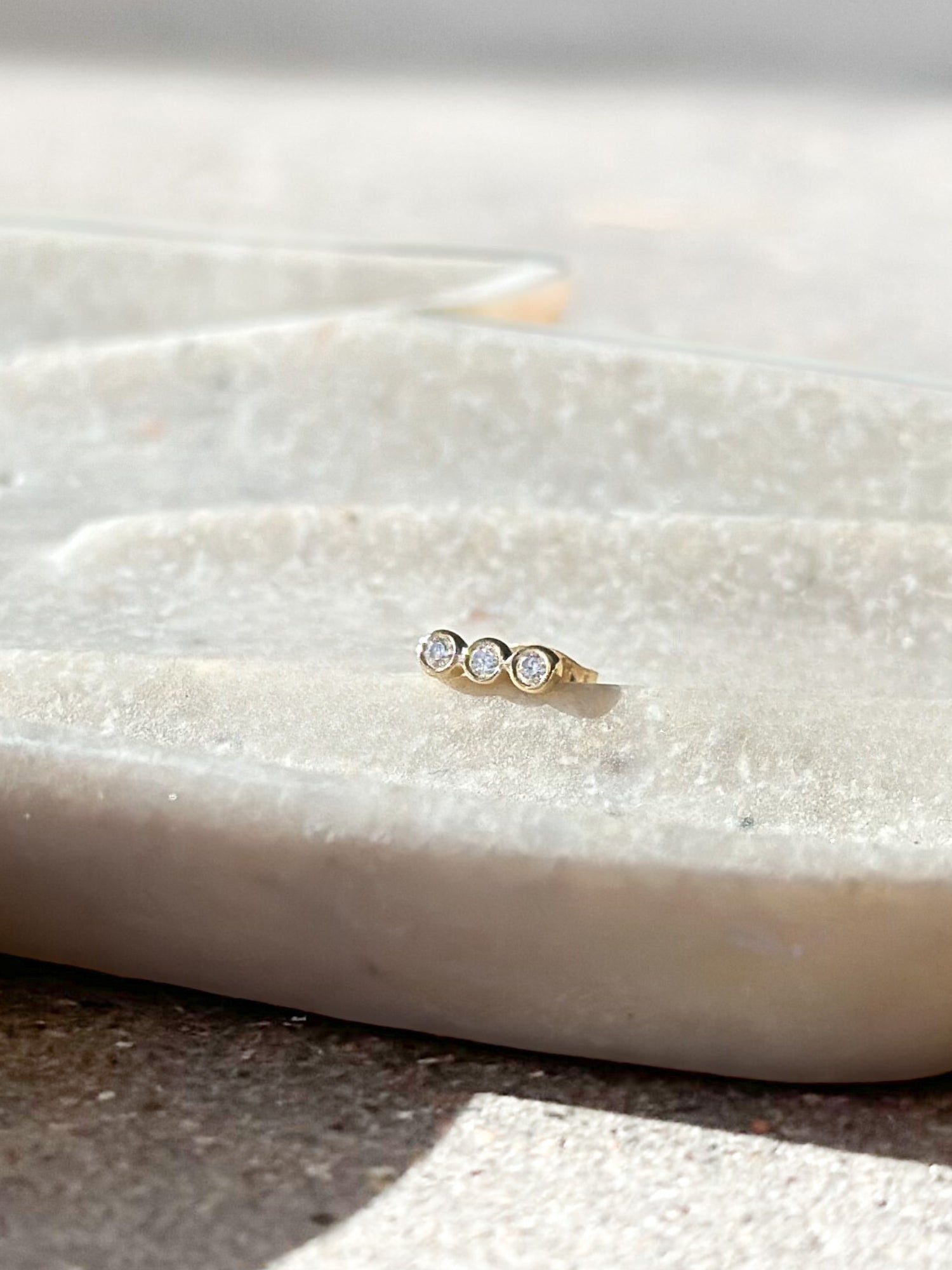 Discover a modern timeless twist with our Vivian Studs. Crafted from Solid 9K Gold, these exquisite earrings feature three round brilliant-cut natural diamonds delicately lined up in shiny bezels. Whether worn alone for a touch of refined charm or paired with your favourite layering necklaces and earrings, the Vivian Studs are a statement of individual style and grace.