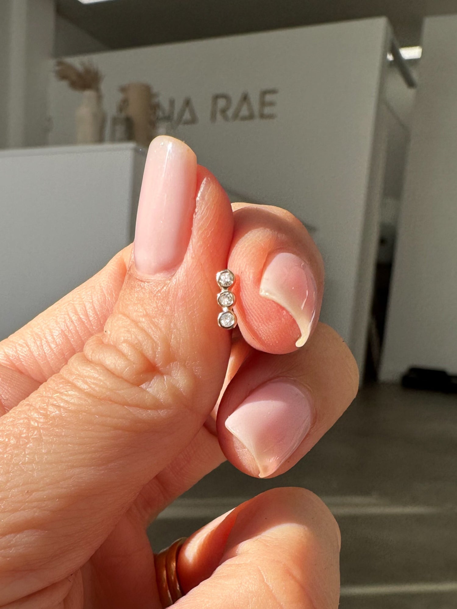 Twist these so they run slightly twisted up the earlobe, this makes them look like multiple little piercings climbing up the lobe.