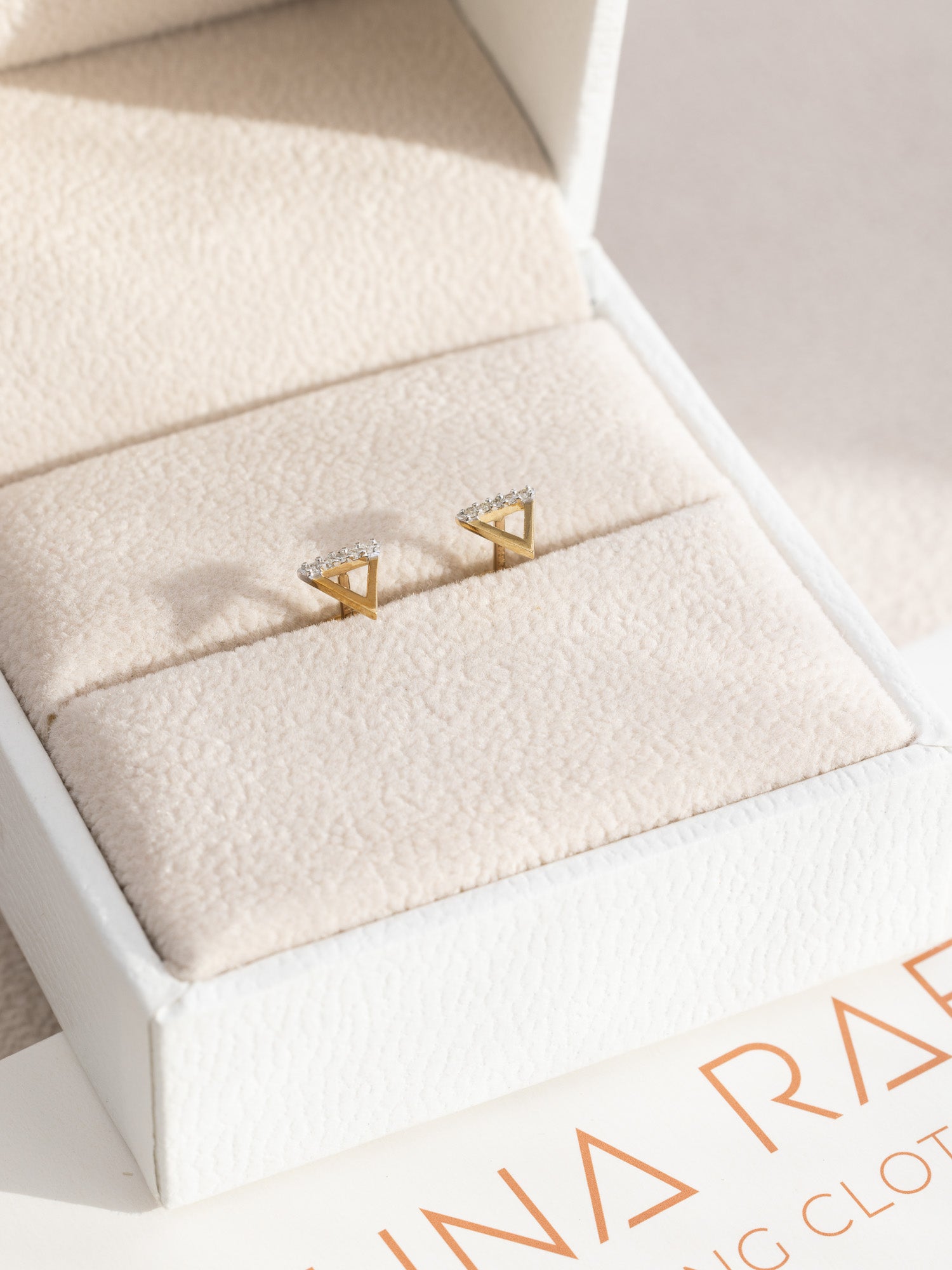 The Water Element Studs embody the spirit of the sea, symbolising the emotional depth and fluidity of those who identify with this element. Crafted from solid 9K gold, these earrings feature a unique water triangle that points downwards towards the ocean, adorned with a line of brilliant-cut white diamonds that mirror the glistening surface of water.